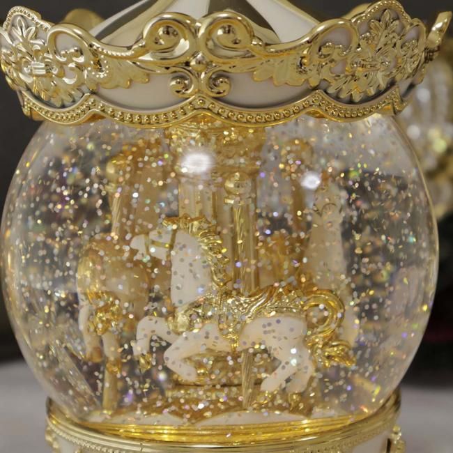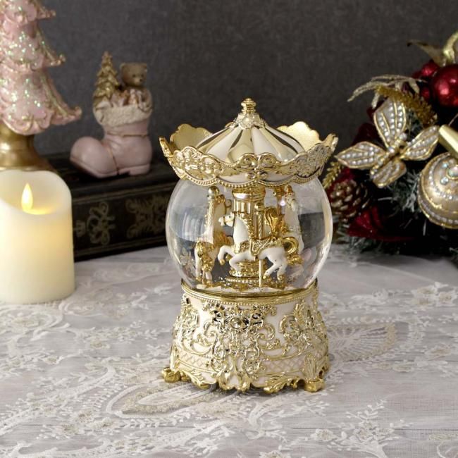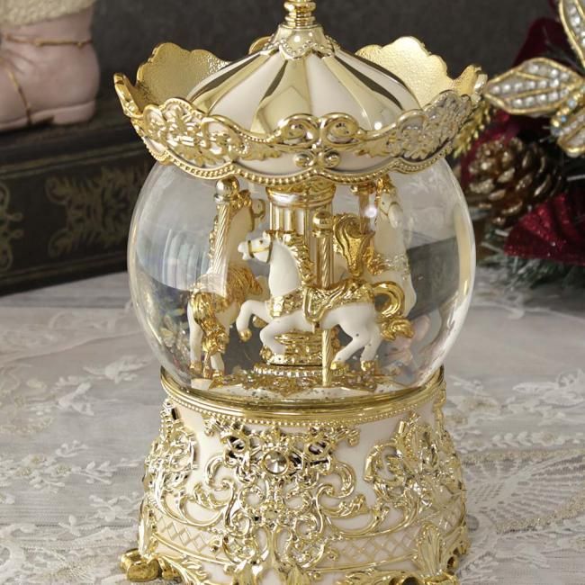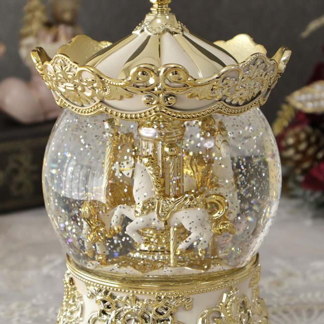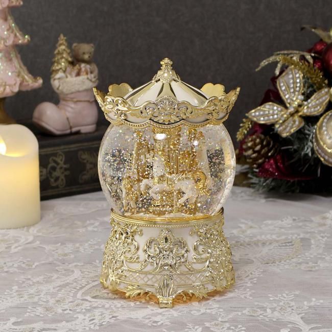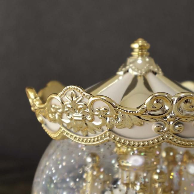 ラグジュアリで華やかなゴールドのカルーセルのLED付きスノードーム。