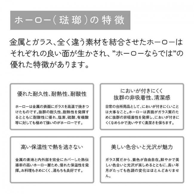 金属とガラス、全く違う素材を結合させたホーローはそれぞれの良い面が生かされ、「ホーローならでは」の優れた特徴があります。